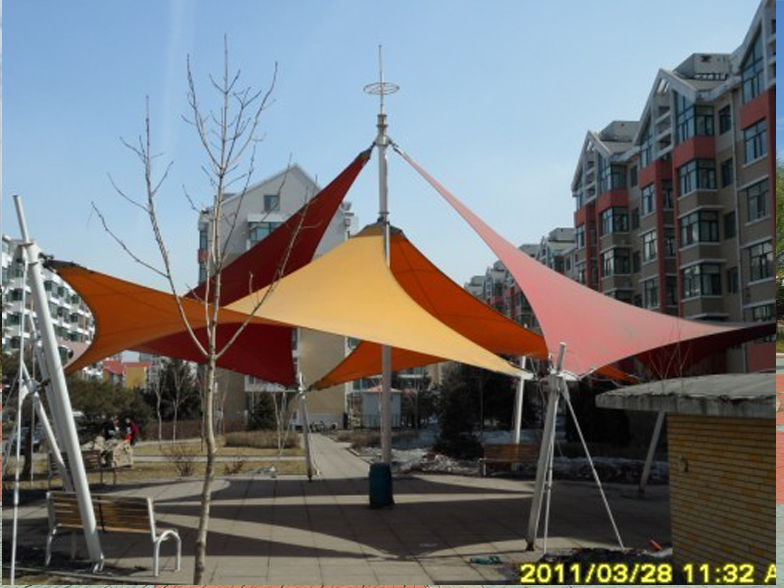 景觀膜結構 景觀膜結構又稱張拉膜景觀,主要通過膜結構的張拉式 呈現(xiàn)出唯美的結構特征;膜材料是指聚酯纖維基布或PVDF、PVF、PTFE等不同的表面涂層,配以優(yōu)質的PVC組成的具有穩(wěn)定的形態(tài),并可承受一定載荷的建筑紡織品。它的壽命因不同的表面涂層而異,一般可達成10-20年;其外觀整潔大方,自潔性強。主要應用于各大公園,世博園,和一些廣場,商場等場所。